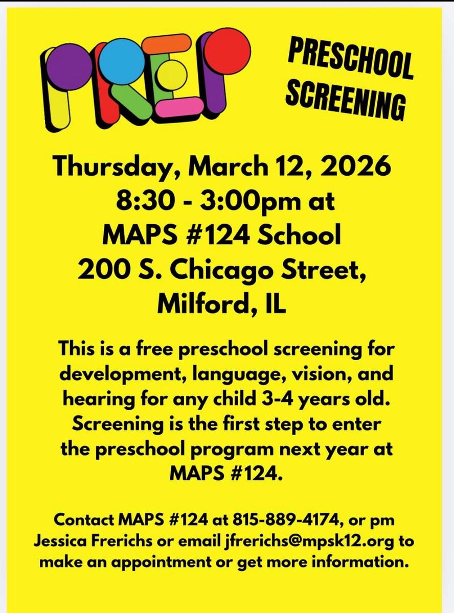 Our screening for preschool will take place on Thursday, March 12th! Be sure to sign up by calling the office at 815-889-4174 or contact: Kendall Frank Kfrank@mpsk12.org Jessica Frerichs Jfrerichs@...
