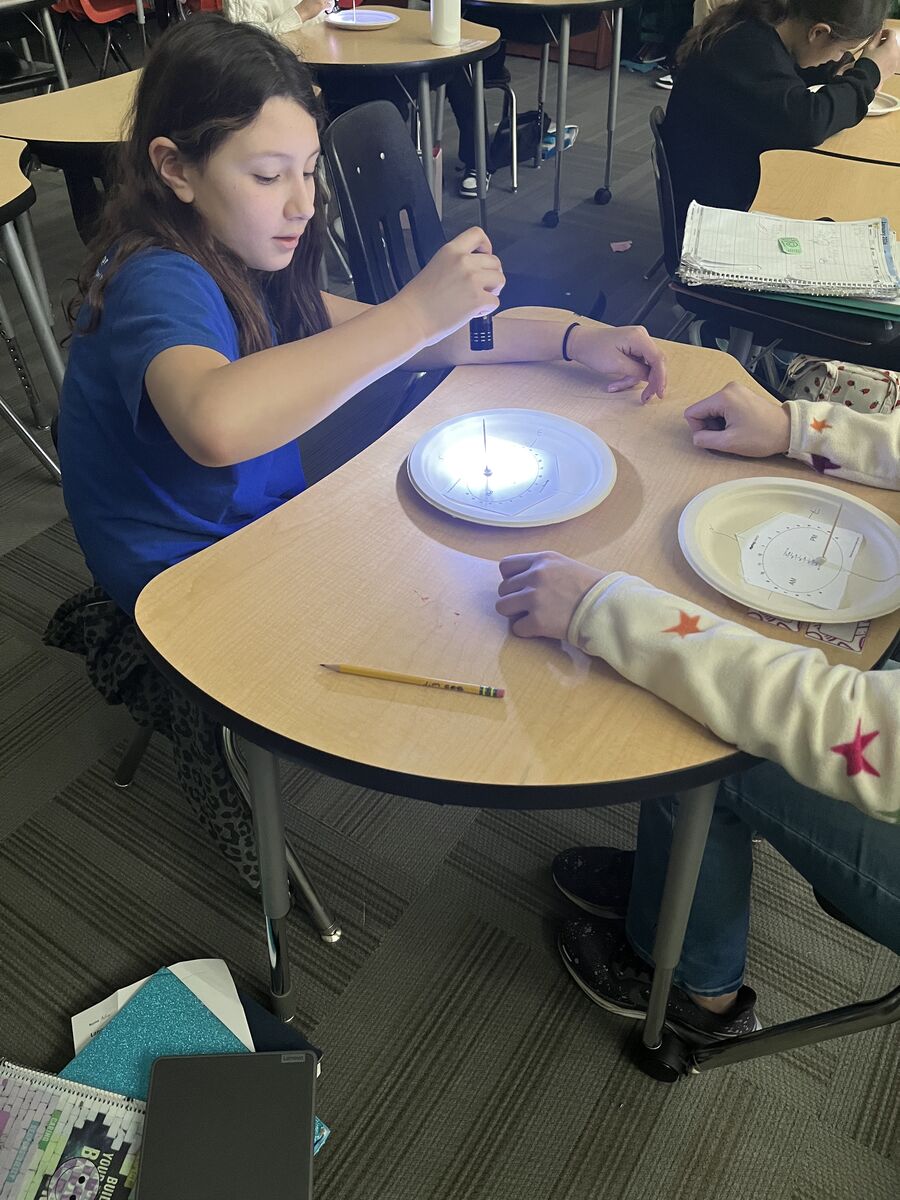 Our fifth grade students created shadow clocks to explore time as it relates to Earth’s rotation and shadow patterns using flashlights to mimic the sun. Look at those little scientists!