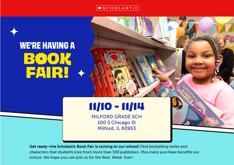 Please see the link for our Book Fair to be held next week: 11/10 & 11/12-11/14. https://bookfairs.scholastic.com/bf/milfordgradesch Our Family Reading Night will be Wed., 11/12 from 6-7pm!