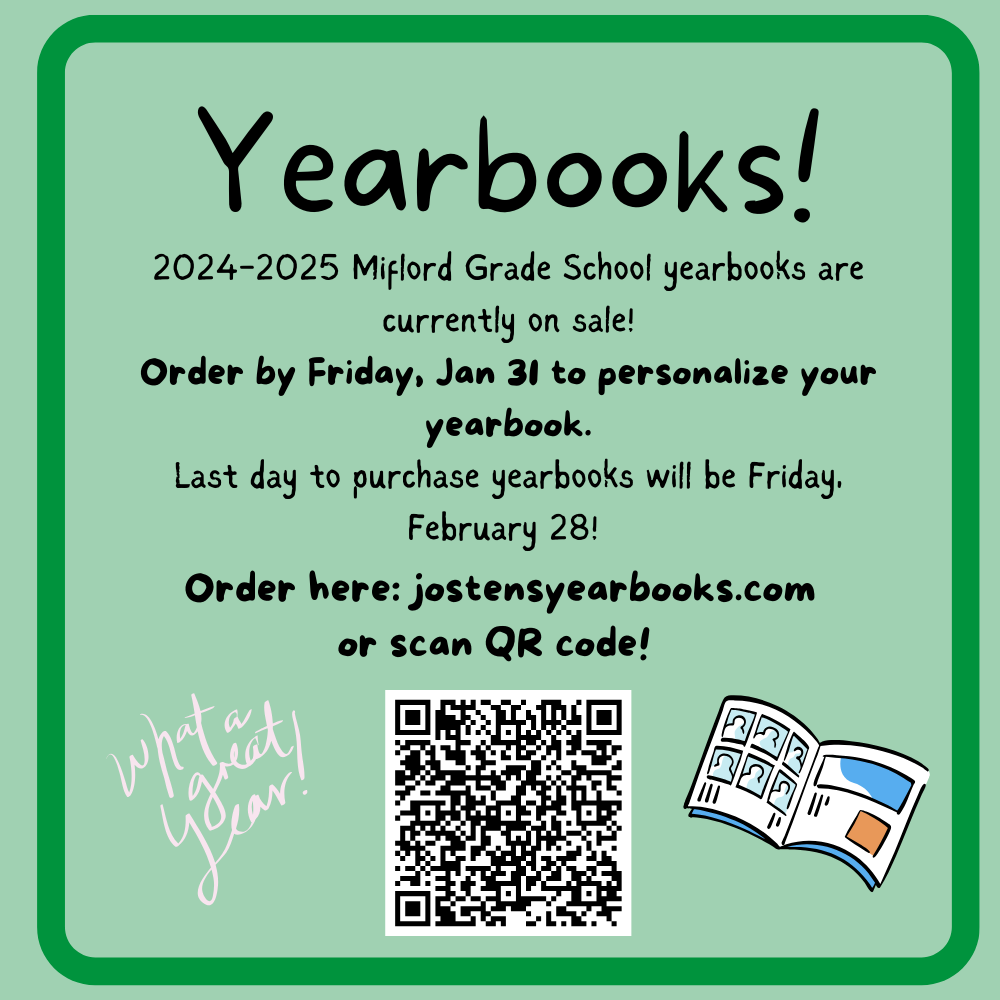 MGS 24-25 yearbooks are on sale! Order by Friday, Jan. 31 to personalize your yearbook. Final day to order regular yearbooks will be Friday, February 28. Use link: https://www.jostensyearbooks.com to order!